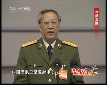陳炳德:在這舉世矚目、激動(dòng)人心的重要時(shí)刻,請(qǐng)?jiān)试S我首先介紹一下前來(lái)視察指導(dǎo)的黨和國(guó)家領(lǐng)導(dǎo)人,親臨北京航天飛行控制中心視察指導(dǎo)的有:中共中央總書(shū)記、國(guó)家主席、中央軍委主席胡錦濤同志,中共中央政治局常委、國(guó)家副主席曾慶紅同志,中共中央政治局常委、國(guó)家政協(xié)主席賈慶林同志,中共中央政治局常委、中央紀(jì)委書(shū)記吳官正同志。親臨酒泉衛(wèi)星發(fā)射中心的有,中共中央政治局常委、國(guó)務(wù)院總理溫家寶同志,中共中央政治局常委李長(zhǎng)春同志,中央政法委書(shū)記羅干同志,中央政治局委員、中央軍委副主席、國(guó)務(wù)委員曹剛川同志,還有全國(guó)人大、國(guó)務(wù)院、全國(guó)政協(xié)的領(lǐng)導(dǎo)。